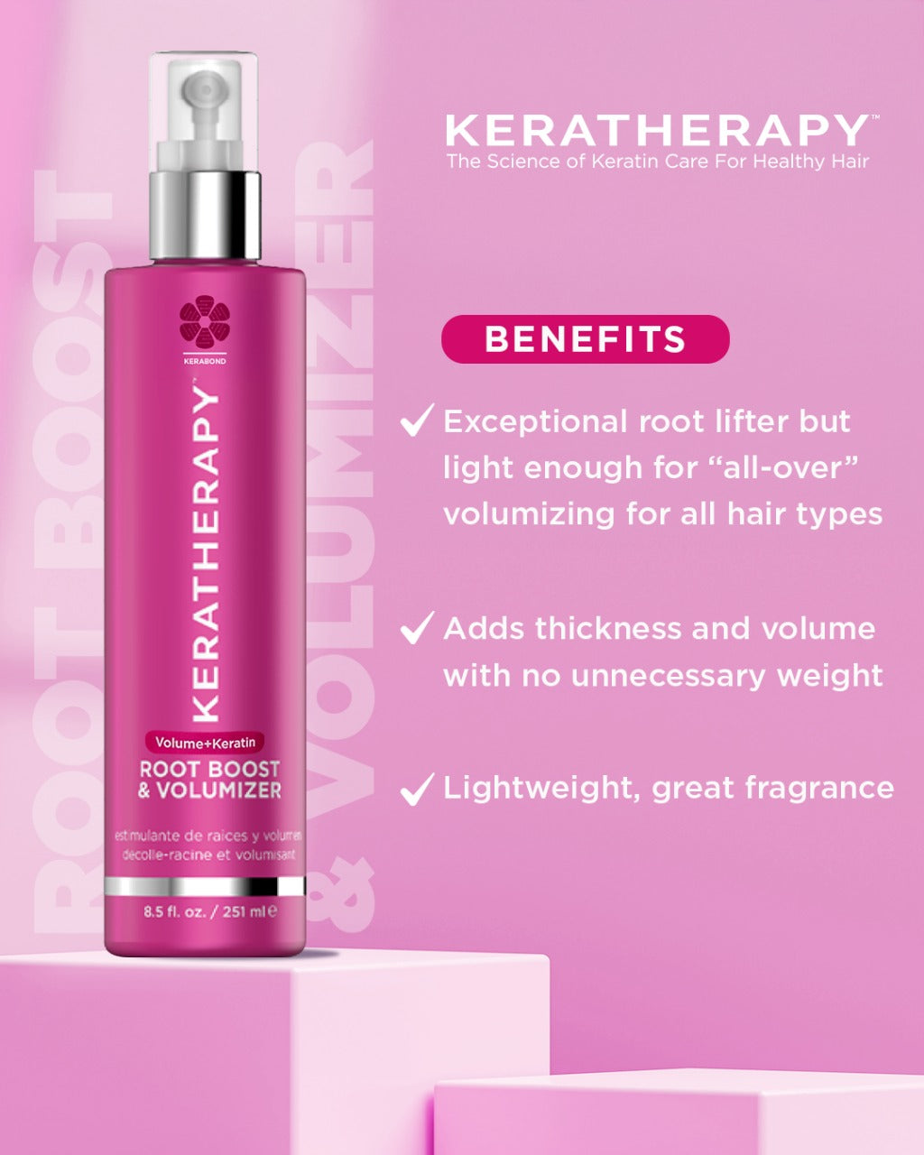 KERATHERAPY'S Volume+Keratin Root Boost and Volumizer is lightweight, keratin-infused, color-safe, volume shampoo, this formula gently cleanses while removing build-up to create body, fullness and texture in the hair. The results are shiny, stronger, more voluminous, manageable, healthy hair.