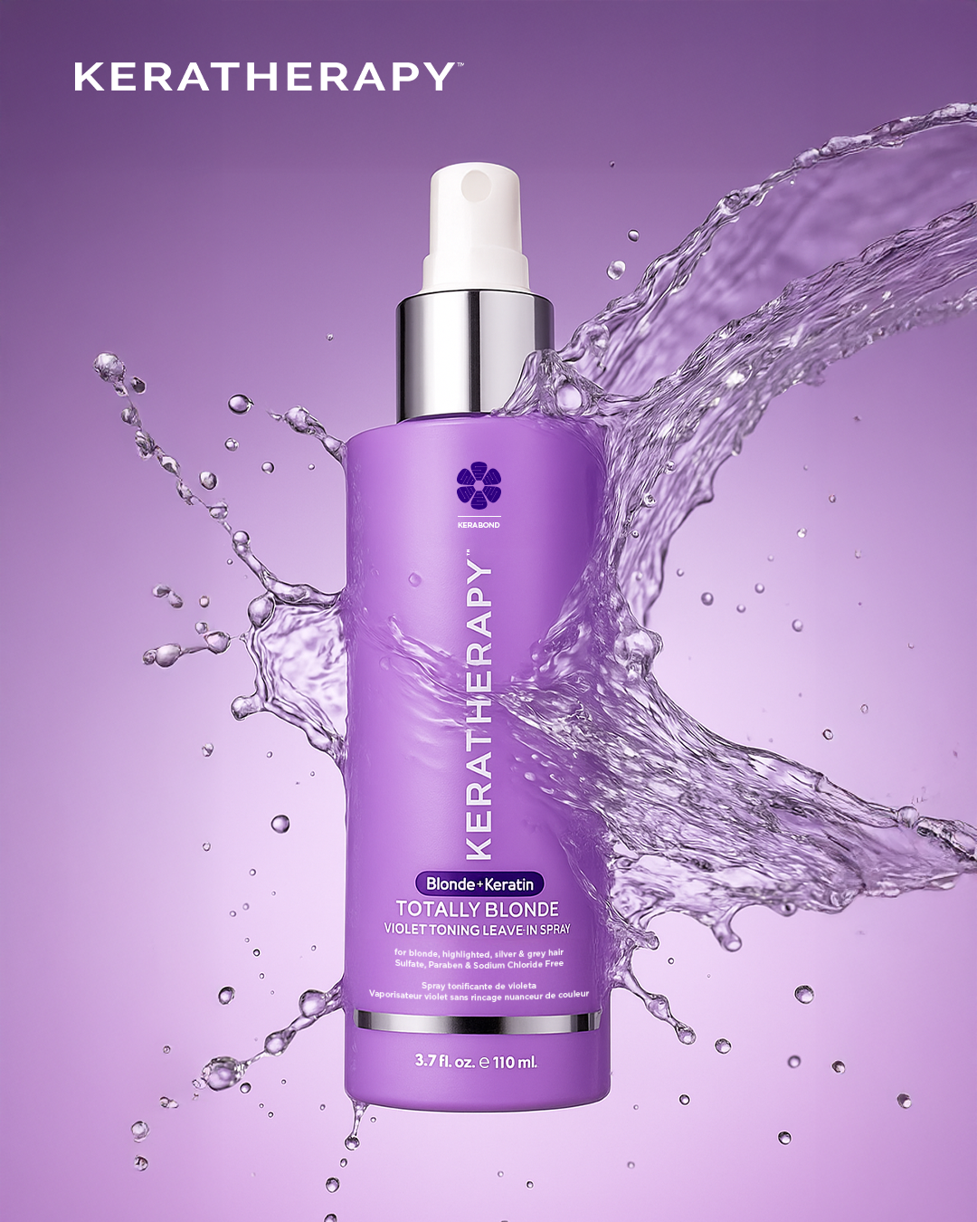 KERATHERAPY's Blonde+Keratin Violet Toning Leave-in Conditioner is a lightweight, keratin-infused leave-in treatment. This violet-based spray conditioner instantly tones brass, seals the cuticle, adds shine and detangles. The results are shiny, smooth, brighter, blonder, healthy hair.