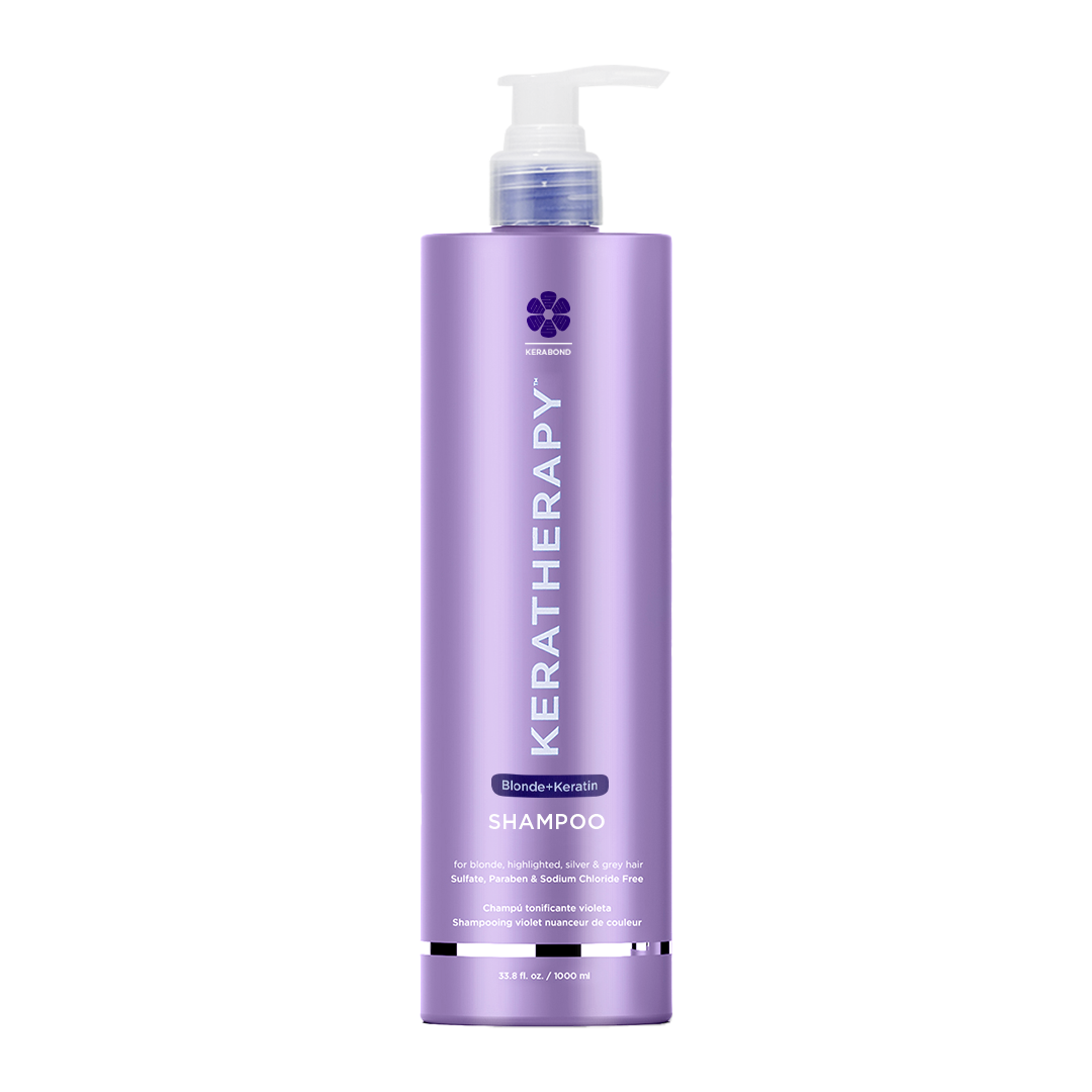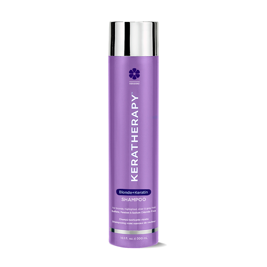KERATHERAPY's Volume+Keratin Shampoo is keratin-infused, violet depositing shampoo, this formula gently cleanses and neutralizes brassy, warm and yellow tones in blonde, highlighted, silver and grey hair without stripping moisture. The results are cooler tones and shiny, stronger, more manageable, blonder, healthy hair.