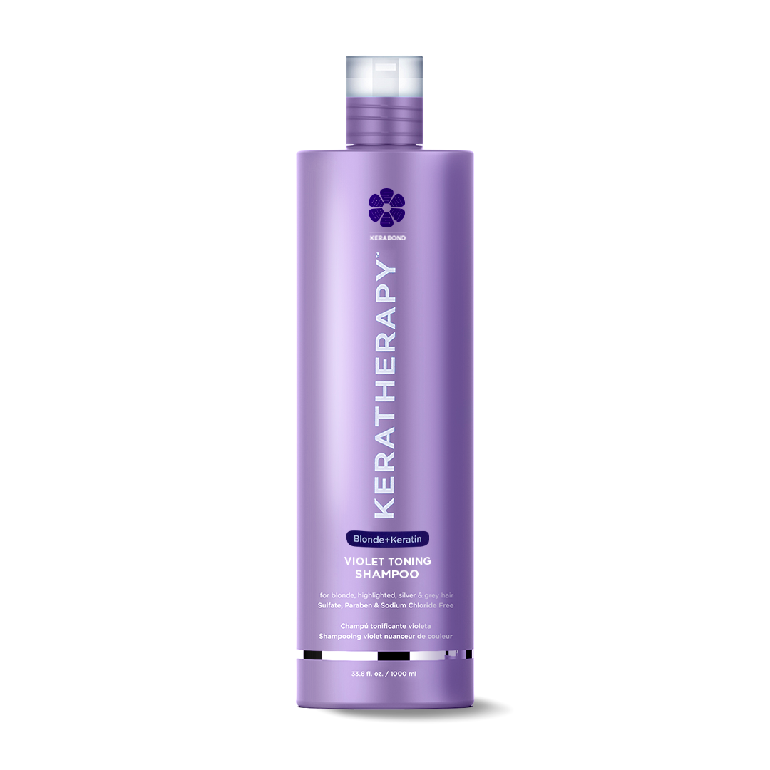 KERATHERAPY's Blonde+Keratin Shampoo is keratin-infused, violet depositing shampoo that gently cleanses and neutralizes brassy, warm and yellow tones in blonde, highlighted, silver and grey hair without stripping moisture. The results are cooler tones and shiny, stronger, more manageable, blonder, healthy hair.