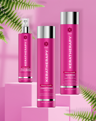 KERATHERAPY'S Volume+Keratin Conditioner is lightweight, keratin-infused, color-safe, volume shampoo, this formula gently cleanses while removing build-up to create body, fullness and texture in the hair. The results are shiny, stronger, more voluminous, manageable, healthy hair.