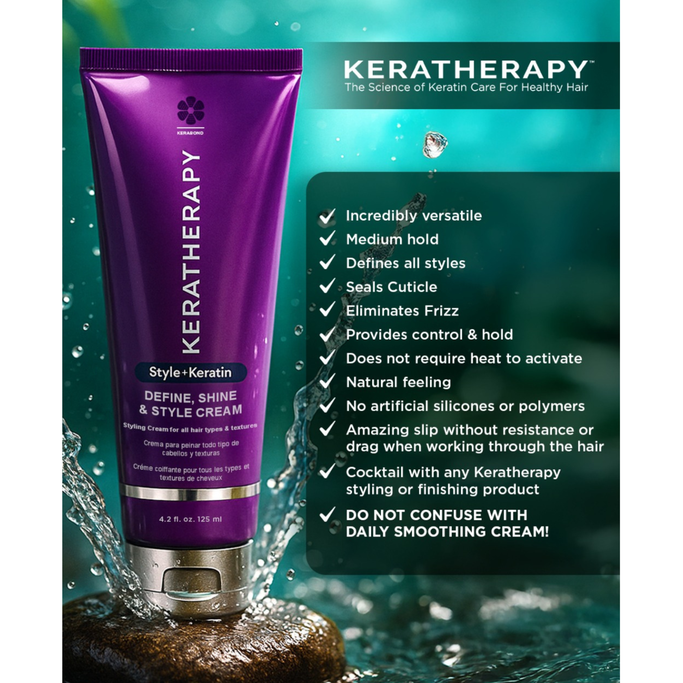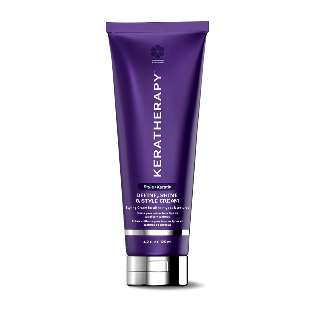 KERATHERAPY'S Define, Shine & Style Cream is an all-in-one styler, this fast-drying, weightless, medium hold, keratin-infused styling cream helps define any style, seal the cuticle, eliminate frizz, protect from humidity, and provide control and hold for all hair types and textures. Cocktail with any Keratherapy styling or finishing product to curate your look. The results are shiny, smoother, more manageable, styled, healthy hair.